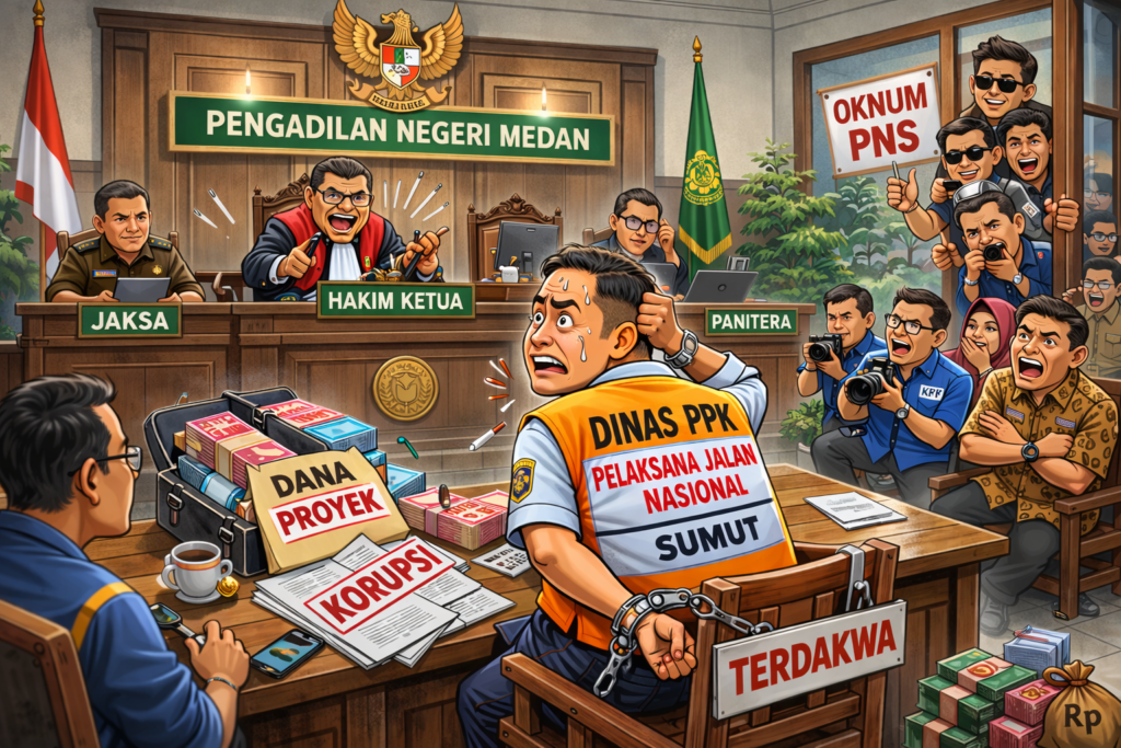 Gambar ilustrasi karikatur persidangan kasus suap proyek jalan di Sumatera Utara