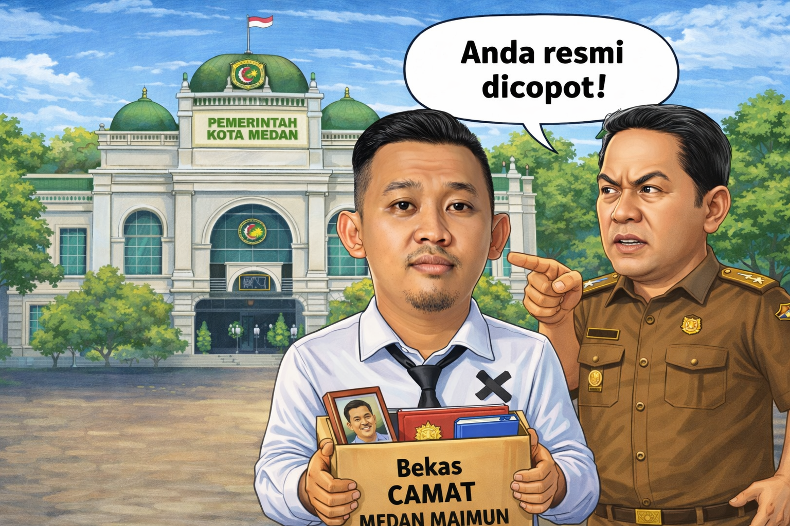 Gambar dibuat rekayasa karikatur Medan.AnalisaOne.com – Almuqarrom Natapradja, yang menjabat sebagai Camat Medan Maimun, telah resmi dicopot...