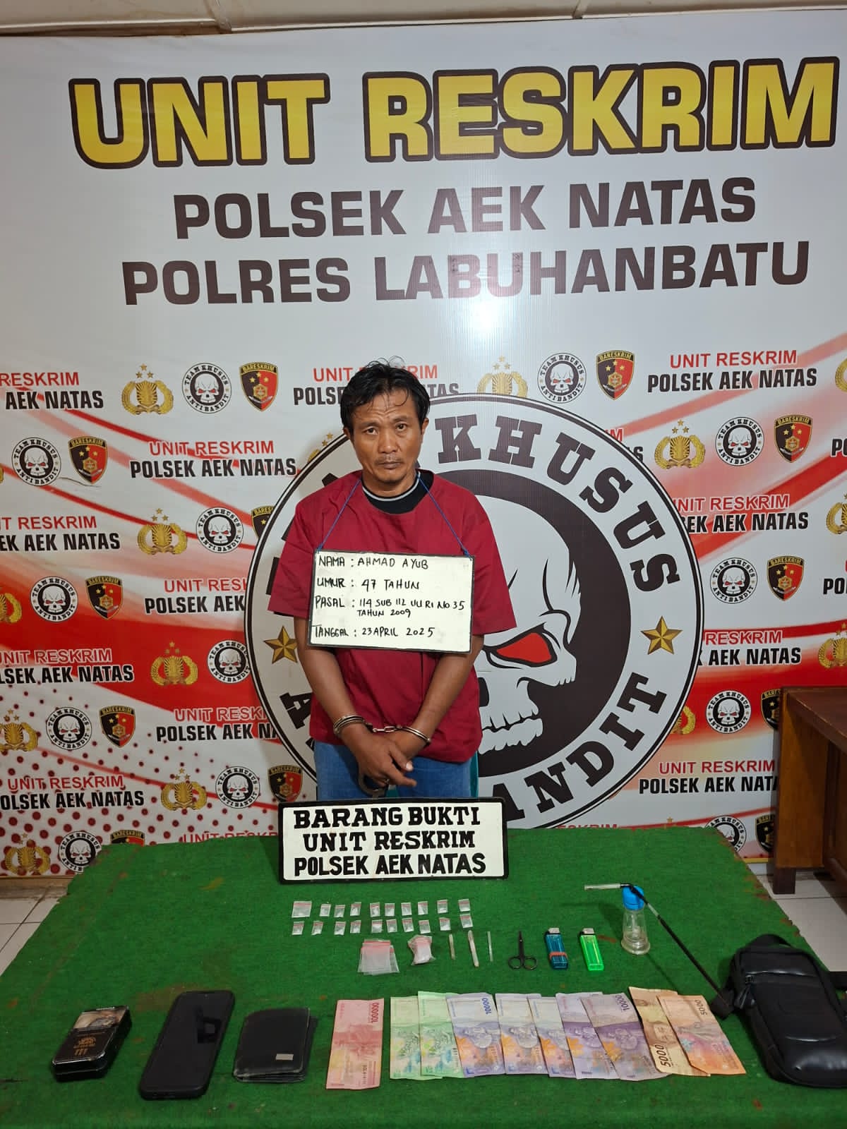 Pada saat di introgasi,pelaku AB mengakui perbuatannya menjual narkoba jenis sabu, sehingga pelaku di bawa ke Polsek Aek Natas untuk proses hukum selanjutnya. (G.Tambunan)